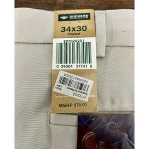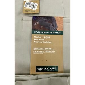 The NWT Dockers Premium Men's Pants in khaki are a stylish and comfortable choice for everyday wear. Made of never-iron cotton, these relaxed fit pants feature a pleated design and a classic beige color. With a size 34 waist and 30-inch inseam, these khakis are perfect for a regular fit. The Dockers brand ensures quality and a timeless style that is versatile enough for any occasion.