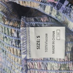 This jumpsuit features a flowy silhouette with a fitted bodice and palazzo-style legs, adorned with a watercolor-like floral print in blue and pink. Crafted from a lightweight fabric, it offers comfort and ease of movement, making it ideal for a breezy, casual yet elegant look.