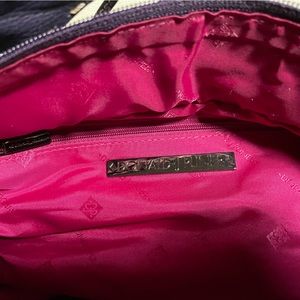 Zipper and leather string closure on top. Zipper pocket on each outer side. Three inside pockets with one being a zipper closure. White stitching accents. Dimensions: 6 1/2” tall, 6” depth, 11” width.