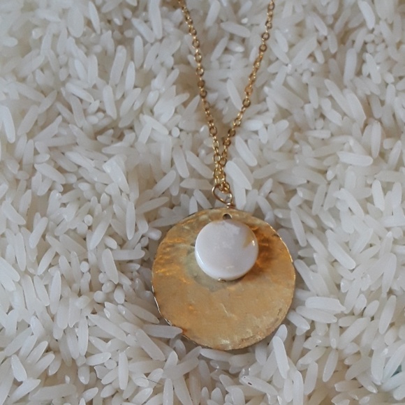 New with tags. Minimalist, modern style. The brass metal was lightly hammered by hand. The shell and metal round are wirewrapped onto an 18" gold chain. This necklace is versatile for your wardrobe