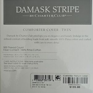 NWT Damask Stripe By Charter Club Comforter Cover, White, Size Twin