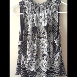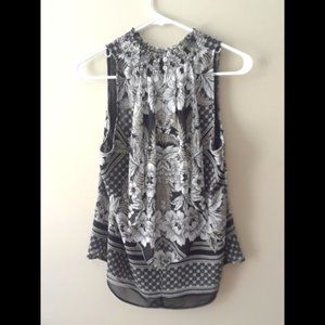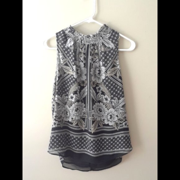 NWT Daniel Rainn Black and White Sleeveless Mock Neck Blouse Size Petite Medium. Gorgeous flowy lined blouse with black, white, and gray floral pattern. Smocked mock neck, deep keyhole back with two buttons at neck, and flowy wing-like panels at the back. Designer and Stitch Fix tags attached with extra buttons. 100% polyester. Back hem slightly longer.