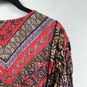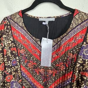 Add texture and charm to your wardrobe with this NWT Daniel Rainn long sleeve knit top in size L, featuring a warm brown and red floral print with quilted detailing. This button popover top includes a flattering peplum hem, making it perfect for boho, romantic, or casual chic styling. The soft knit fabric offers all-day comfort with a polished look.