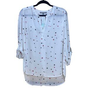 NWT Daniel Rainn Split Neck Blouse White Novelty Print Roll Tab Sleeve Women’s Size L