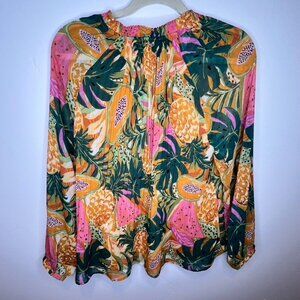 Tropical print blouse with long sleeves and ruffle collar, offering a chic and colorful look. Lightweight polyester fabric, perfect for various casual settings.