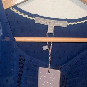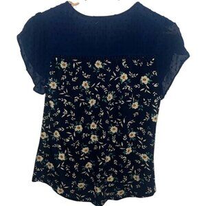 New with tags short sleeve top from Daniel Rainn in size PXS, petite extra small. Top and sleeves are a sheer material with textured polka dots. Flowered part of the blouse is a soft stretchy knit. Pit to pit measurement 17”. Brand new with tags, no flaws.