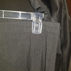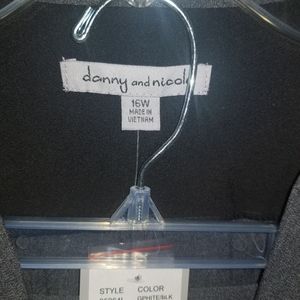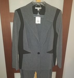 Grey pantsuit with black contemporary, slimming details on the jacket. size 16w. Pants have side elastic waist for a better fit.