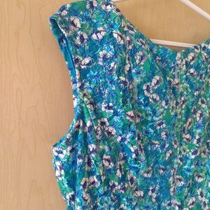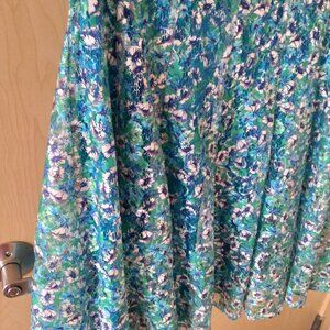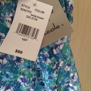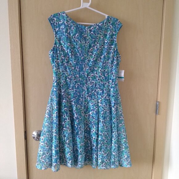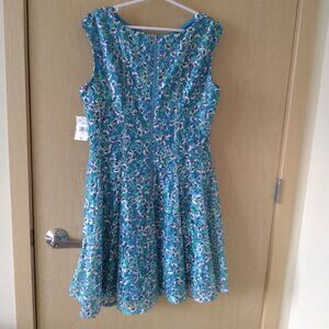 Brand new spring dress by Danny and Nicole. Features green, blue, and white floral detail on a lace layer. Blue lining layer underneath. Zipper on the back. Retails for $89.