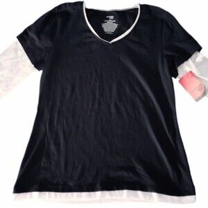 This is a long sleeve top by Danskin. Navy Blue color with semi sheer white swirl sleeves.