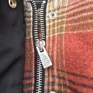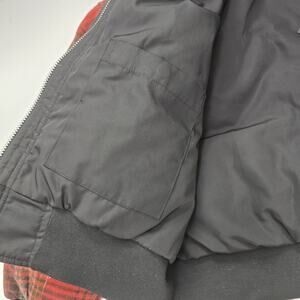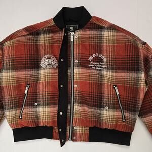The NWT Darc Sport Wolves Club Flannel Jacket is a stylish and versatile addition to any woman's wardrobe. Made in a brimstone red plaid pattern, this short jacket features long sleeves and a relaxed fit. The zip and snap closure makes it perfect for travel, casual outings, or workwear. With its bomber jacket style and embroidered details, this jacket is a fashionable choice for all seasons.