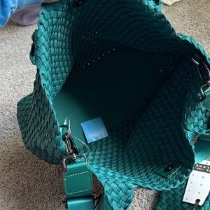 Elevate your style with this NEW WITH TAGS chic dark green / emerald woven tote bag, complete with a matching pouch. Perfect for everyday use, it combines elegance and practicality.