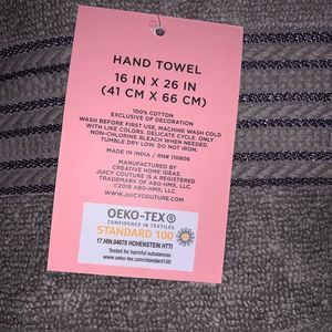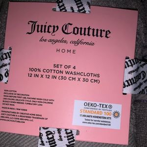 Brand new with tags dark grey juicy couture towel set. This towel set includes, two bath towels (30 inches by 58 inches), one hand towel (16 in. X 26 in.), and one set of four washcloths (12 inches by 12 inches). This set is an absolute must have. It would make a perfect Christmas gift. Anyone who loves Juicy Couture would love this. This would make anybody’s bathroom look adorable. Thank you for taking the time to look at my listing. Please feel free to make me an offer I can’t resist.