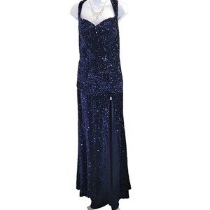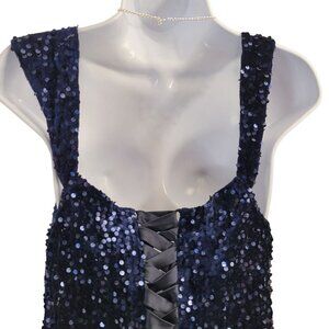 Dark blue evening gown adorned with sequins. Features a corset back and a sultry thigh slit. Sleeveless design, perfect for formal occasions. New with tags.