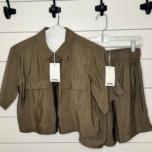 Perfect for summer! (I'm open to reasonable offers.) This complete set from the Darling, Society is brand new with tags. The shorts have pockets and also feature a wide elastic band for maximum comfort. 85% Modal, 15% Polyester, Machine wash cold w/ like colors, delicate cycle. Tumble dry low. Here is a link to the original set on their website: https://darlingsociety.com/products/playful-short?variant=45299042615587