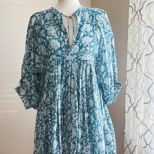 NWT Kyra mini dress in a babydoll silhouette with romantic billowing sleeves and full bodied skirt. Unlined for the perfect beach day, vacation or carefree wear. Beautiful hand block printed pattern in Ocean Blue colorway. 100% cotton, thin but not sheer. Can also add a slip underneath if you wish. Underbust and length of dress according to DOI official size chart: 33.5"~33.9", equivalent to US size 2-4. Style is intended for loose fit.