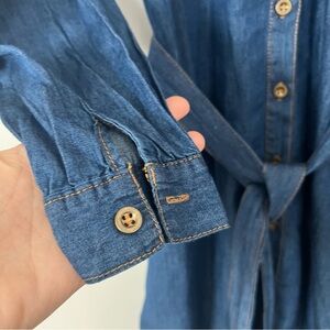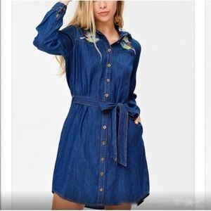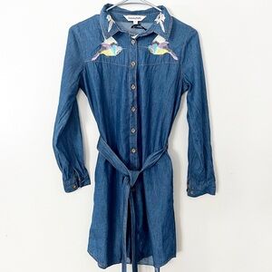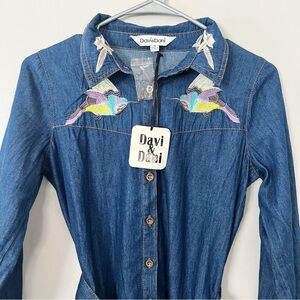 NWT Davi & Dani Denim Embroidered Shirt Dress Cotton Chambray Bird Pockets Small