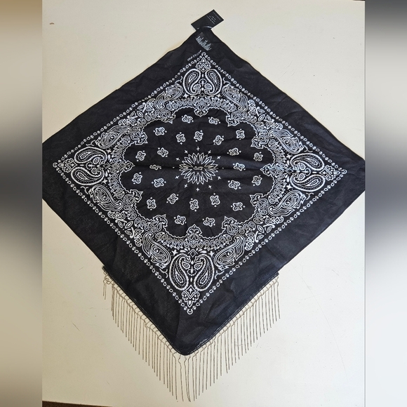 New with tags- David and Young black and white iconic design bandana featuring a silver bling chain feature, 100% cotton and a 21 inch x 21 inch size. This fun bandana can be worn on your head for a cute hair accessory or head covering or as a scarf to jazz up any outfit.