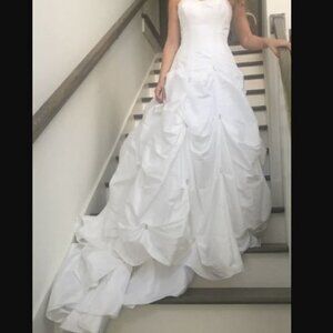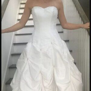 This white taffeta wedding dress is a size 10 The sweetheart neckline showcases tasteful beadwork, and the back laces closed, creating the true Princess effect brides strive for on their wedding day. The bodice has boning in it and the train is the full chapel length. The train does have pickups in it, perfect for bustling so you can dance the night away at the reception.