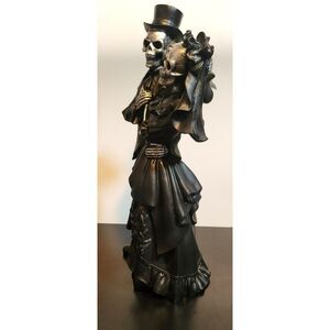 13" tall black & silver Day of the Dead bride & groom dancing the night away for you Halloween enjoyment. Made of resin, it features black & silver color scheme with a matte finish. It is from the Nicole Miller Halloween Collection and will add so much to your decoration. Note the detail of the skeletons and the dress. Stunning piece.