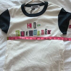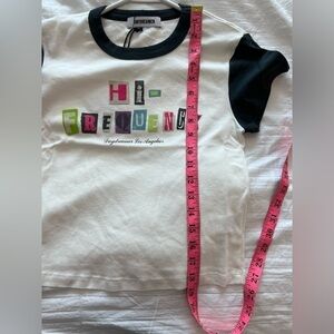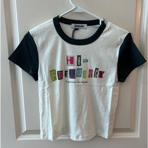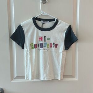 Fitted slightly cropped baby tee style. Ransom note style graphics. Color block sleeves and collar.