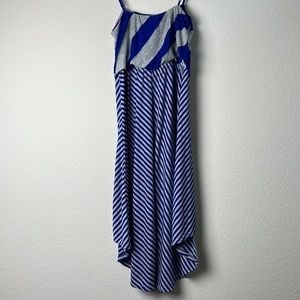 Cobalt blue and heather grey stripe hi-low dress, adjustable spaghetti strap, elastic waist.