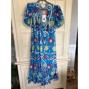 NWT De Loreta size large Izula wrap dress in Roco Celeste print. This dress needs a small easy repair. The part that wraps around the front is missing its tie. I have shown a close up of where it should be. I would sew on a plain white piece and no one would ever know but I am leaving that up to you.