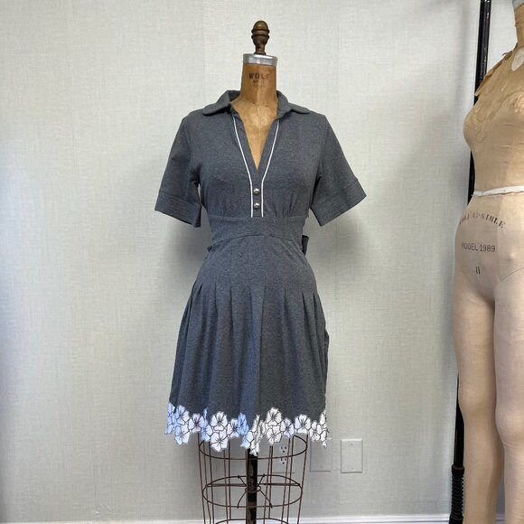 This is deadstock from the early 2000s. This brand Suzabelle had a long run making beautiful sustainable and fair labor clothing. This is one of their earlier pieces The dress has a side zip and tie back waist. The skirt has a pleated waist and flares out into laser cut floral embroidery. The fabric is very nice quality and has a lot of stretch. This brand runs large so an Xsmall would fit a small and even a medium. PLEASE SEE THE MEASUREMENTS!