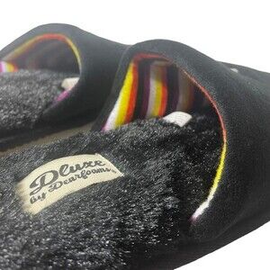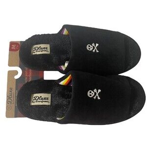 NWT Dearfoams DLuxe slippers with memory foam. New with tags, black plush slippers with embroidered skull & crossbones Jolly Roger, rainbow fabric lining, textured rubber bottom.
