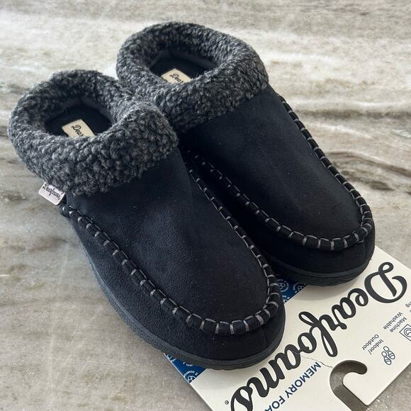 Brand new with tags (NWT), these Dearfoams Marshall slippers in black are designed for ultimate comfort and convenience. Made with a soft microsuede upper, flannel lining, and a terry footbed, these slippers are the perfect blend of cozy and durable. Featuring temperature-regulating technology, these slippers help keep your feet comfortable year-round, whether you need to stay warm or cool.
