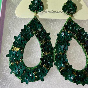 NWT Deepa Gurnani Anthro Beaded Crystal Flower Statement Earrings Forest Green