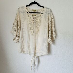 NWT Democracy Blouse Beige S Embroidered Open Crochet Lace Peasant Boho Cottage