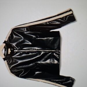 Ride off into the sunset in this sleek biker jacket expertly crafted from faux leather with cream stripes on sleeves, shoulders & back.