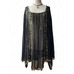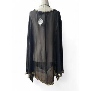 Gorgeous brand new sheer black tunic top with gold sequin embroidery throughout. From denim 24/7. Size 26w- measurements in photos. The tag is missing but the bag with extra sequins is intact and the blouse appears unused.
