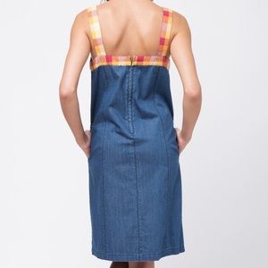 I am selling this denim jean dress, size Large. It’s a midi dress, sleeveless with thick straps and has pockets. Brand new with tags, NWT. The trim on the straps and neckline are a red yellow flannel material. The denim is a medium color. The brand is MoVint.