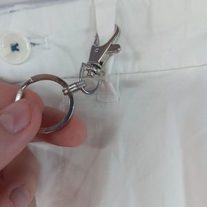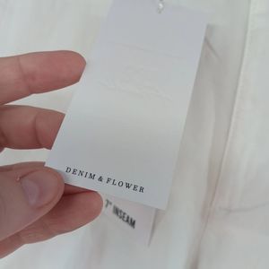 Elevate your summer wardrobe with these stylish Bermuda style shorts from Denim & Flower Ricky Singh. Crafted in a cotton blend fabric with a solid pattern, these white shorts feature a flat front and mid-rise waist for a comfortable fit. The attached key chain ring, embroidered logo, and 5-pocket design add subtle accents to the classic style. These shorts are machine washable and perfect for any occasion, whether it be a casual day out, a workwear essential, or a party/cocktail event. The stretch feature provides added comfort and flexibility, making them perfect for beach activities or a round of golf. Available in size 29, see photos for waist size.