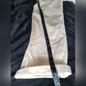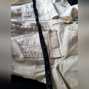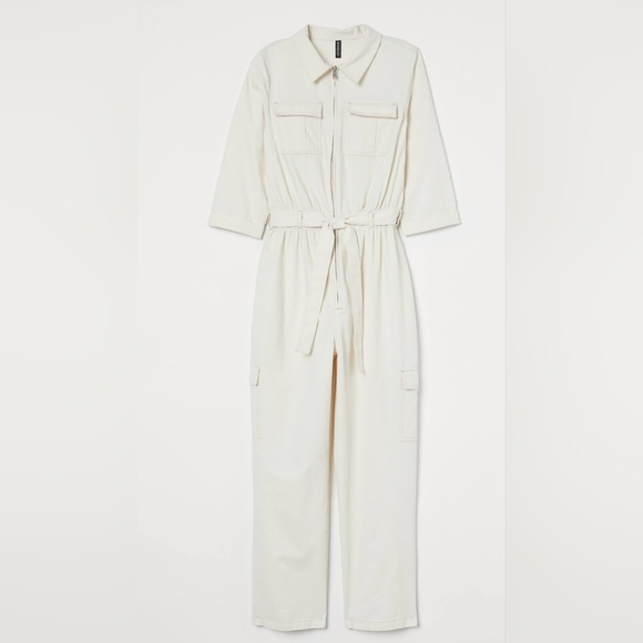 Boiler suit in cotton denim with a soft brushed finish. Collar, a concealed zip down the front and a yoke at the back. Flap chest pockets, 3/4-length sleeves, a tapered waist with a sewn-in tie belt at the front, and tapered legs with flap leg pockets.