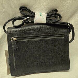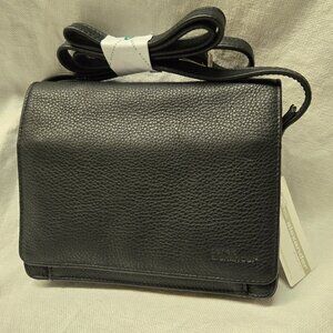 A well-respected Canadian Brand, this Derek Alexander leather bag is brand new with its tags. The flap is kept closed by magnets and the interior is absolutely bursting with organizational potential. A zippered pocket under the flap. Another one dividing the main pocket into two sections. Card slots. Drop pockets. Pen loop. Removable key ring, etc.