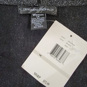 Designer Originals black/silver sparkle cardigan. Underarm measures 24.5" from seam to seam. Sleeve measures 22.5" from shoulder. Length is 27.5". Stretch/sparkle black and silver acrylic poly spandex. Size 1X NWT