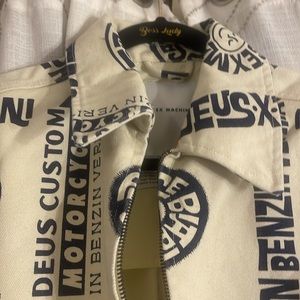 NWT Deus Ex Machina Men’s M Cream/Black Jacket Zip Close Denim Text Pattern Logo