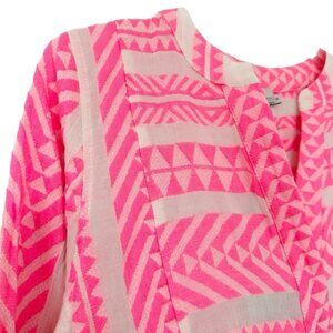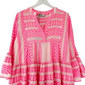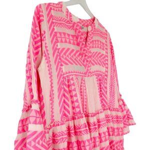NWT Ella dress by Devotion Twins from Anthropologie. Neon pink and off white. Stylish and spirited this dress fuses a heady mix of vivid color, bold tailoring and effortless style. Made from 100% breathable pre-washed cotton for a softer touch, this gorgeous boho-style summer dress features delicate ruffled details and striking geometric embroidery. With a V-neck, relaxed tailoring and bell sleeve cuffs this elegant and versatile tunic dress can also be worn as a Kaftan or paired with jeans making it perfect for any occasion, alternatively, wear it with a belt at the waist to create a shorter look. Made in Greece. As seen on blogger/influencer Blair Eadie from Atlantic Pacific. Brand new with tags!