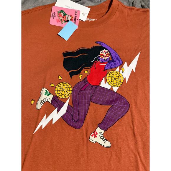 NWT Dia Pacheco x Golden Hour Urban Outfitters Crew Neck Shirt Burnt Dark Orange 100% Cotton Comfortable Soft Short Sleeve Causal Streetwear Bright Fun Spanish Graphic Trendy Indie Playful Bohemian Graffiti