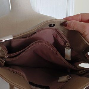 NWT Diahann Carroll taupe handbag with beautiful silver metal detailing. Exterior back zip pocket. Interior has middle zipper section as well as pockets on each side; all hardware still wrapped in manufacturers tissue. Magnetic snap closure. Pebbled fake leather. Smoke and pet free home.