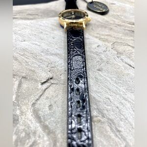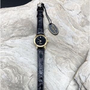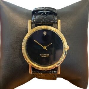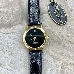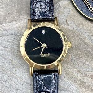 Vintage Diamond quartz ladies watch, NWT, simple black face with gold trim and genuine leather band.