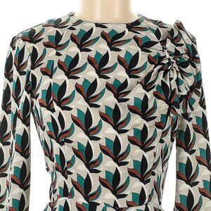 New with tags, DVF dress with a geo floral like print. Very fun. Tan/beige color with black, green/teal, brown, cream print. Long sleeves. Invisible back zipper. Floral bow like gather detail at side neckline. Silk, spandex blend. Size 6.