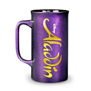 This tall, porcelain mug is shining, shimmering, and splendid. The finish boasts an iridescent, purple glimmer topped with the classic title logo, making this the perfect and functional gift as a memory of your time for Aladdin!