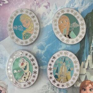 The set includes four collectible trading pins featuring characters and locations from the movie Frozen: Elsa, Anna, Olaf, and the Arendelle Castle.