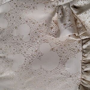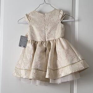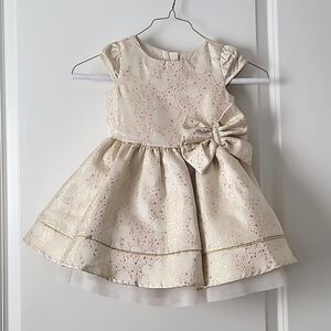 Fancy Gold Holiday Dress with subtle Mickey Mouse design in gold fabric. Front bow detail, tulle ruffle underlayer. Back zip closure.
