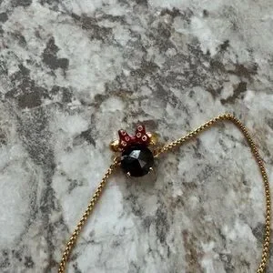 Chic gold bracelet by Kate Spade. Features a black charm with a red bow accent. Perfect for adding a playful touch.