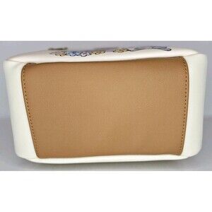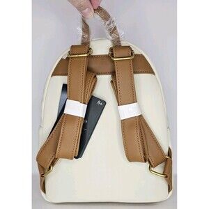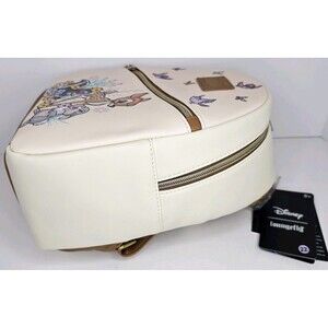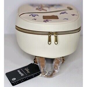 This Disney Loungefly mini backpack is a must-have for any fan of the classic movie characters, Bambi and his friends. The backpack features a cream and brown faux leather exterior with gold hardware accents, a zip closure, and adjustable brown faux leather straps. The semi-circle shape and soft tag accents add a touch of whimsy to the design, while the pink fabric lining and flower pattern create a cute and unique interior.