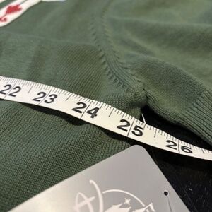 The shirt is a green knit, with six white stripes running down the front. It has a v-shaped neck with an open collar, but it’s not a button-up. A mountaineer is silhouetted on the chest climbing up one of the stripes. The Yeti is peeking out from behind another stripe near the sleeve. The stripes themselves are decorated with red, green, and blue Swiss-inspired patterns.